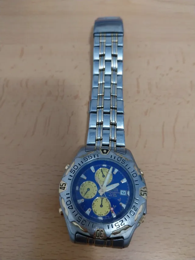 Reloj Lotus con cronógrafo y esfera azul. - Bisel con marcadores. - Correa de metal. - Subesferas amarillas.