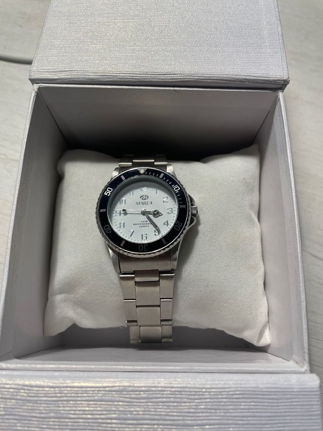 Detalles del productoReloj con correa acero plateada, esfera blanca y bisel negro. El reloj se encuentra en su caja original.