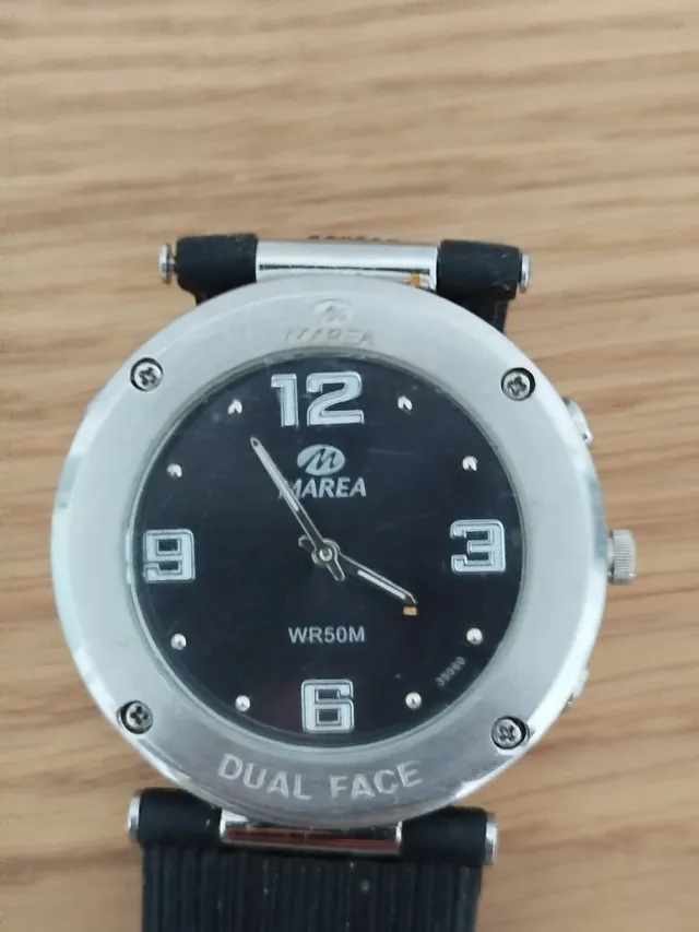 Detalles del productoReloj de pulsera Marea con doble pantalla y correa negra.