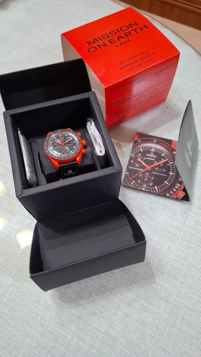 Detalles del productoReloj con su caja, modelo Lava, parte de la colección MoonSwatch.
