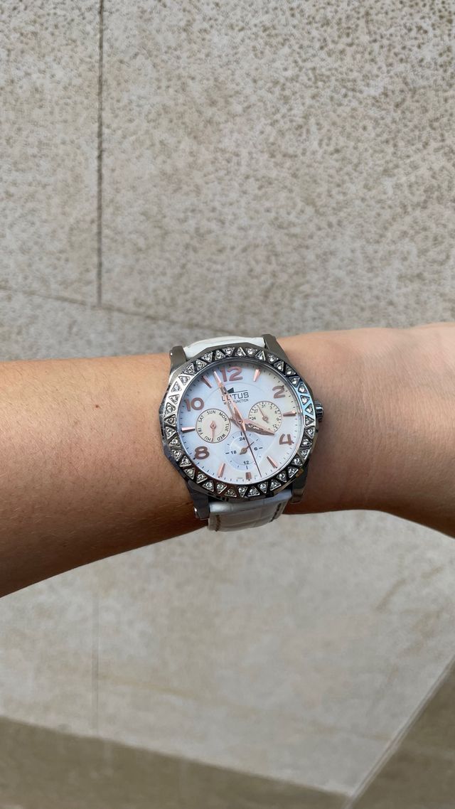 Reloj de mujer Lotus con correa de cuero blanca y pila recién cambiada.