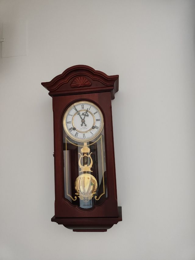 Reloj de pared de madera, con péndulo. Funciona por cuerda y esta en perfectas condiciones. - Diseño clásico y elegante.