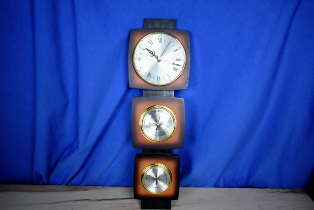 Detalles del productoClásico reloj de pared de los años 60 en madera con termómetro y barómetro, funcionando en buen estado, la maquinaria es Alemana, mide 57cm de alto, 19cm de ancho, el reloj mide 16cm de diámetro, el barómetro 10 cm de diámetro y el termómetro 9cm de diámetro. Envíos solo a través de ingreso o transferencia bancaria en la Caixa y el envío por correo certificado