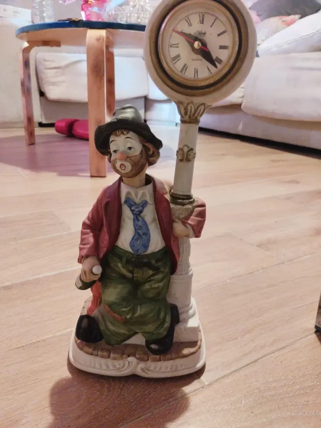 Figura de payaso con reloj antiguo. - Detalle de payaso con traje y sombrero. - Reloj con esfera y manecillas. - Base decorativa.
