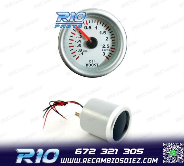 Detalles del productoMóvil: 672 321 305 - Referencia: RLC146086. RELOJ PRESIÓN TURBO FONDO BLANCO ILUMINADO Especificaciones: Tamaño: 52mm Color fondo: Blanco Iluminación: Led Blanco Medida: -1 A 3 Bares Incluye: Tuberia y Conector