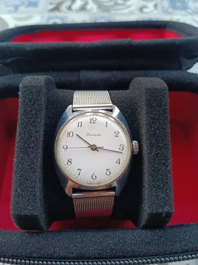 Reloj mecánico de la marca Raketa, fabricado en la URSS. - Esfera blanca. - Correa de malla metálica. - Diseño clásico y elegante. Más de 50 años