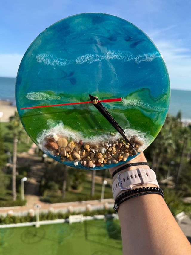 Reloj artesanal de resina epoxi con un diseño inspirado en el mar.