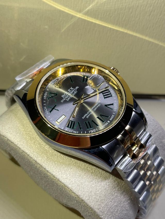 Detalles del productoElegante reloj Rolex Oyster Perpetual Datejust automático con bisel dorado y esfera gris. Un clásico de la relojería suiza.