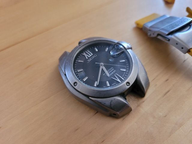 Detalles del productoReloj Seiko 8F32-004A Calendario Perpetuo de titanio. El reloj presenta una estética elegante y moderna.