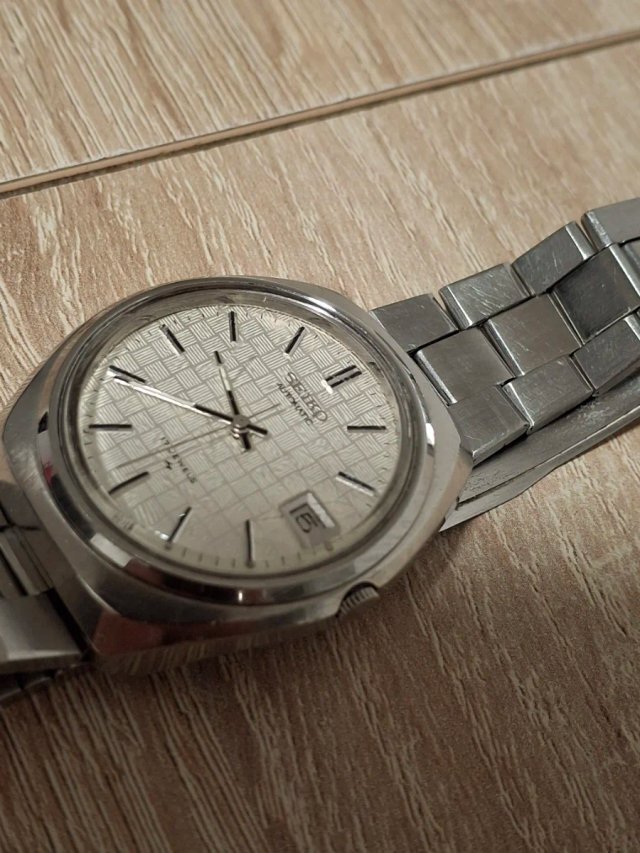 Reloj de pulsera Seiko automático año 1977 famosa con su esfera texturizada en tonos plateados y blancos. Un accesorio clásico y elegante.funciona y mantiene perfecto la hora.cambio rapido de fecha.brazalete original del reloj.