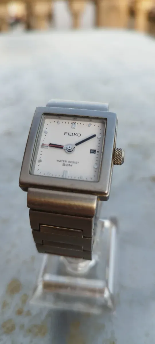 Detalles del productoReloj Seiko Quartz V782-5C30 con diseño cuadrado elegante y brazalete original de acero inoxidable. Pila recién cambiada, funciona perfectamente. Esfera blanca con segundero rojo y ventana de fecha. Water Resist 50 m. Estilo clásico y robusto, ideal para uso diario o colección. En buen estado general, con leves marcas de uso.