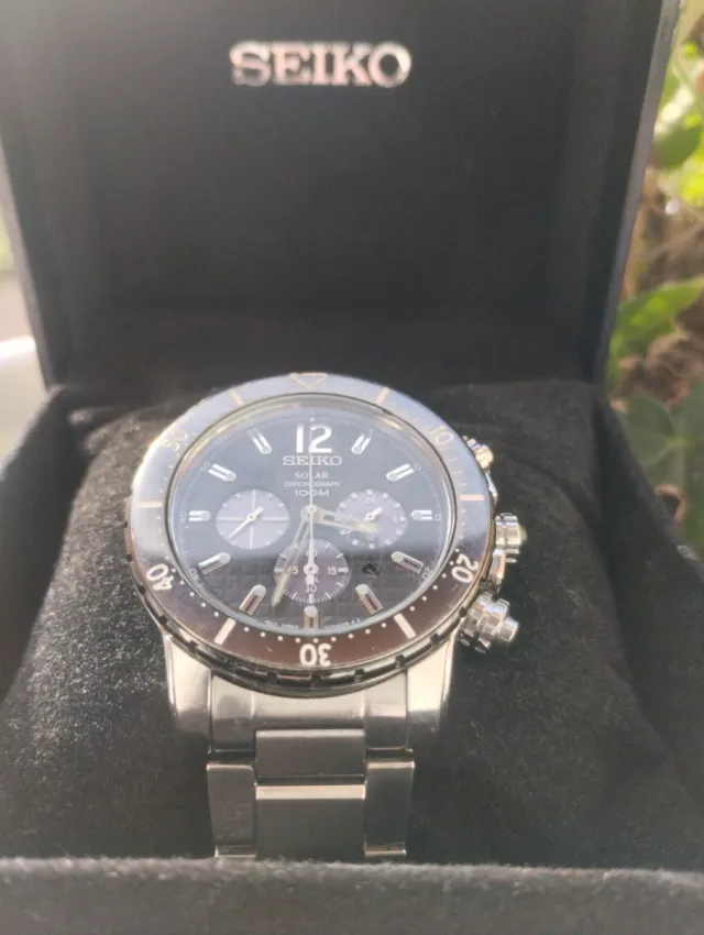 Detalles del productoReloj Seiko con movimiento solar y cronógrafo.