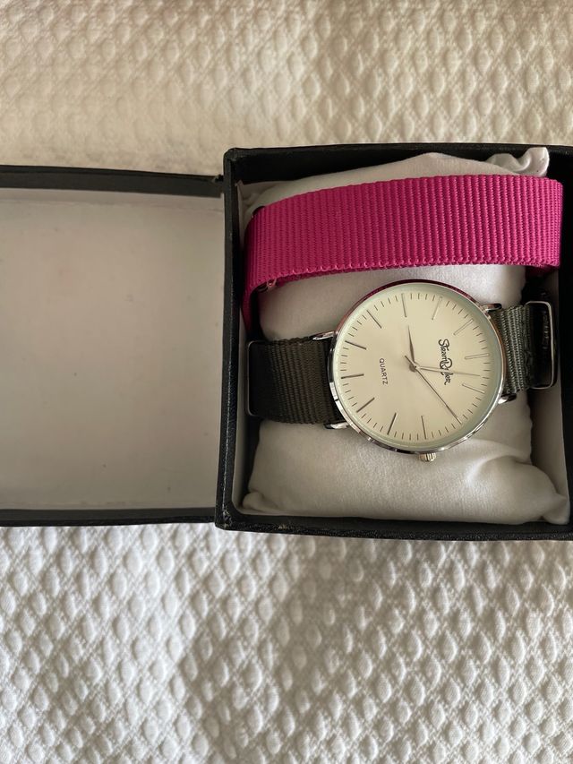 Reloj nuevo sin usar en caja original con dos correas intercambiables en color verde militar (caqui) y rosa fucsia.