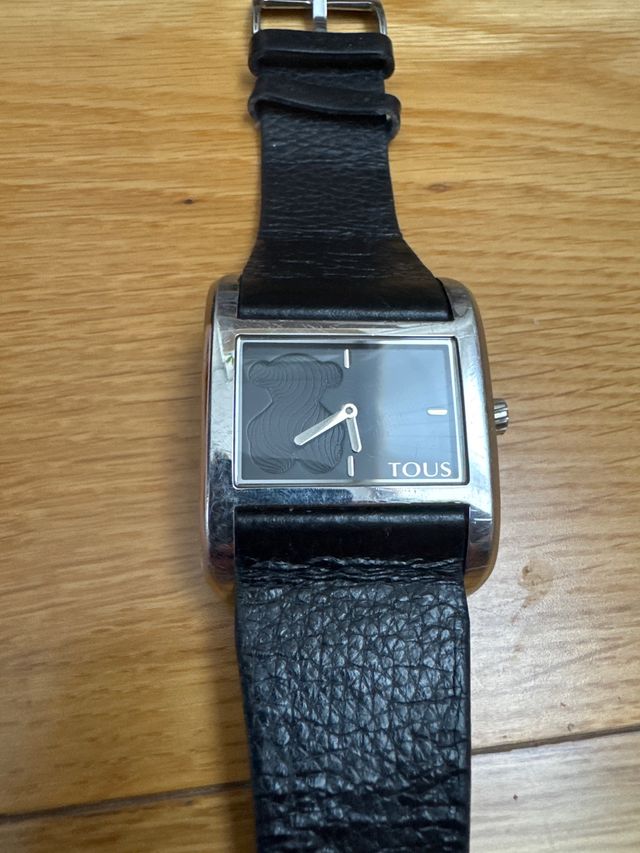 Elegante reloj Tous con correa de cuero negra y detalles plateados.