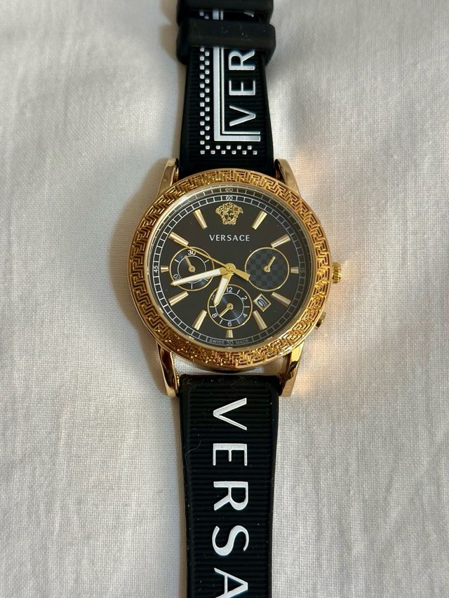 Elegante reloj Versace con detalles en dorado y correa negra.