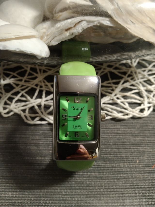 Detalles del productoReloj de mujer marca SOLE automático en perfecto funcionamiento con la pila recién puesta. La correa es de acero, rígida forrada con un original color verde pistacho