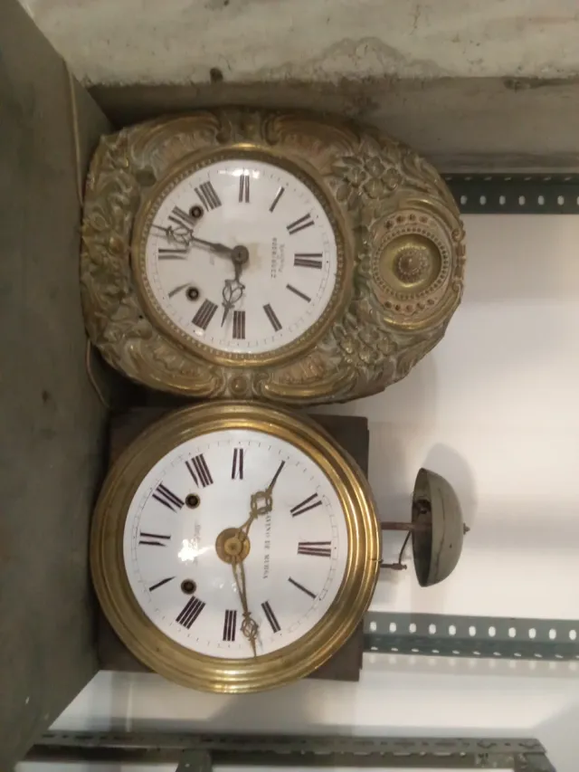 Detalles del productoDos relojes antiguos de pared con esfera blanca y números romanos.