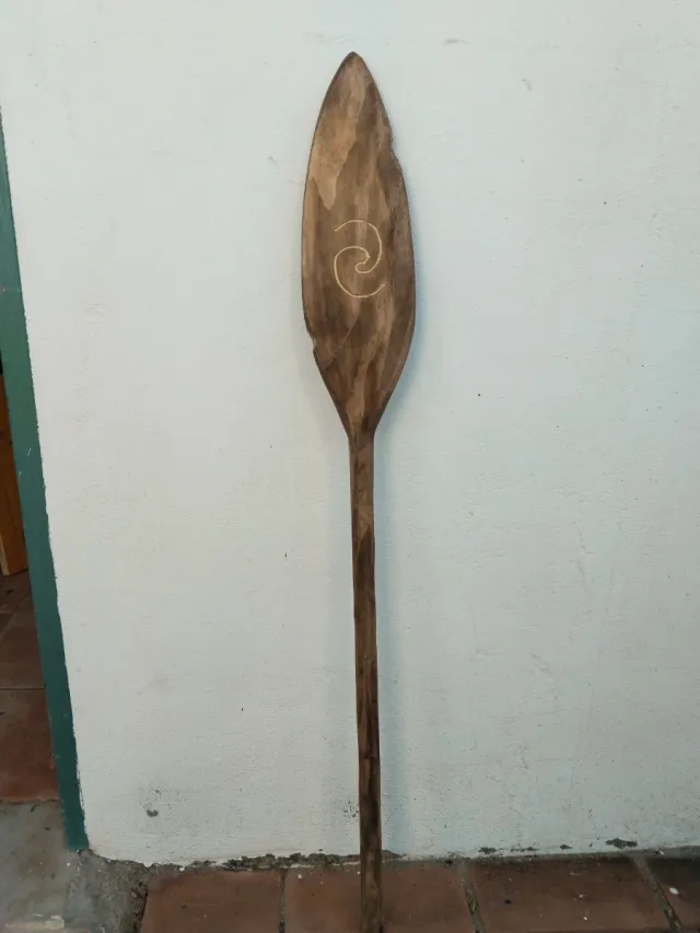 Remo de madera con un diseño grabado en la pala. - Diseño de espiral. - Material: Madera.