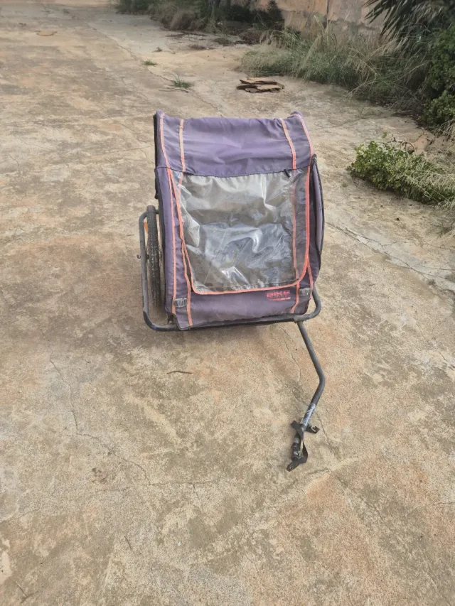Remolque para bicicleta diseñado para transportar a dos niños de forma segura. - Estructura resistente. - Ventanas transparentes. - Color morado.