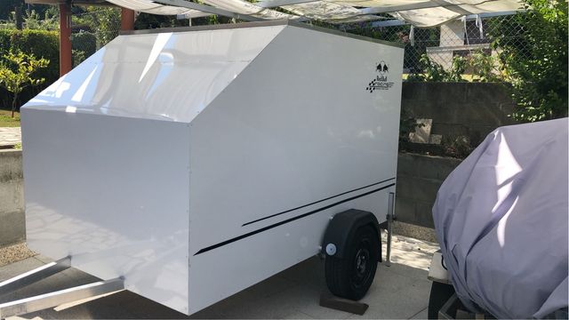 Detalles del productoRemolque cerrado de aluminio con techo abatible y puerta con rampa.