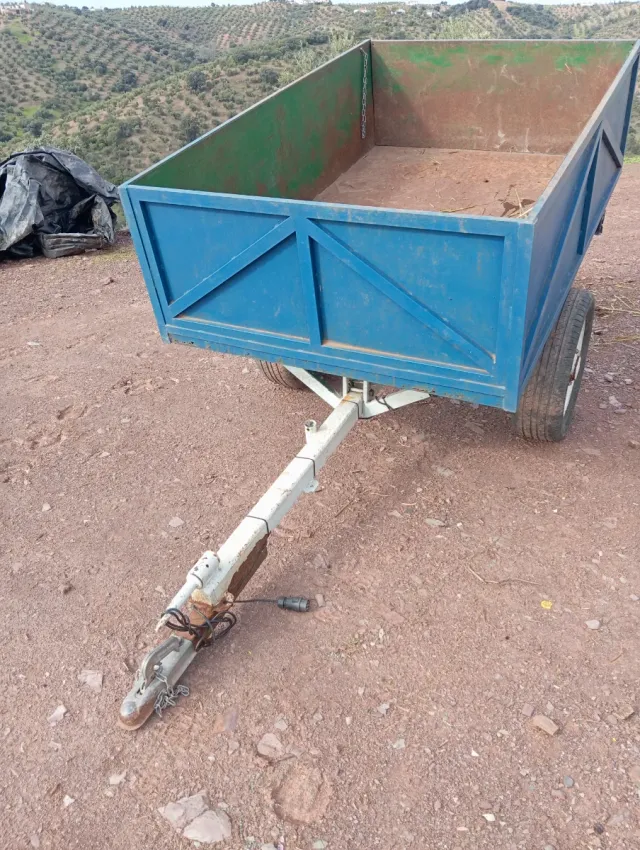Remolque de carga con laterales de metal. - Color azul exterior y verde interior. - Cadena de seguridad. - Ruedas incluidas. Es basculante manual.