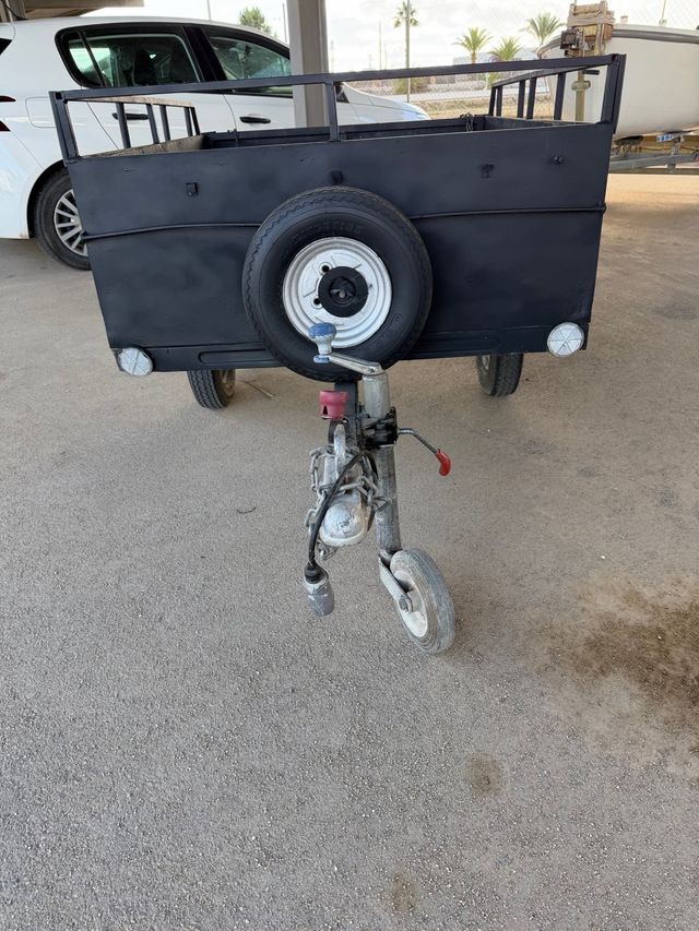 Detalles del productoRemolque de carga de color negro, con una rueda de repuesto montada en la parte frontal.
