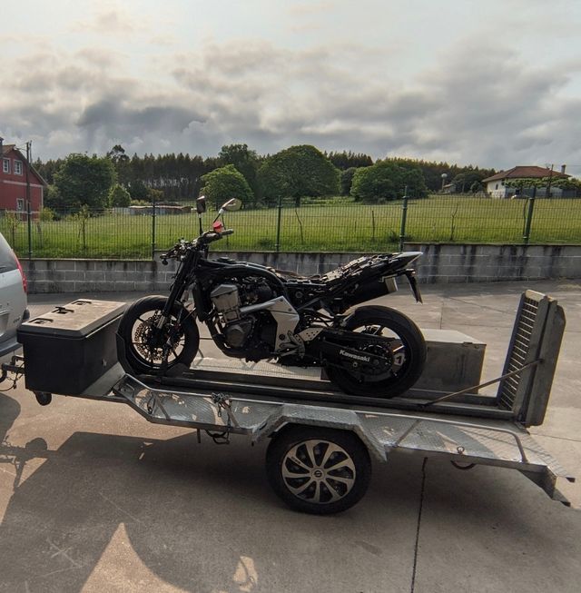 Detalles del productoPlataforma para remolcar motocicletas con una capacidad de 750 kg con documentación, rodamientos y cubiertas nuevas. Se pueden cargar motos de enduro o de carretera hasta 250 kg. Rueda de 13". Sin freno de inercia pero no le hace falta, muy estable. Lleva instalado una mordaza para la rueda delantera para poder fijar la moto y atar las eslingas sin que se caiga.