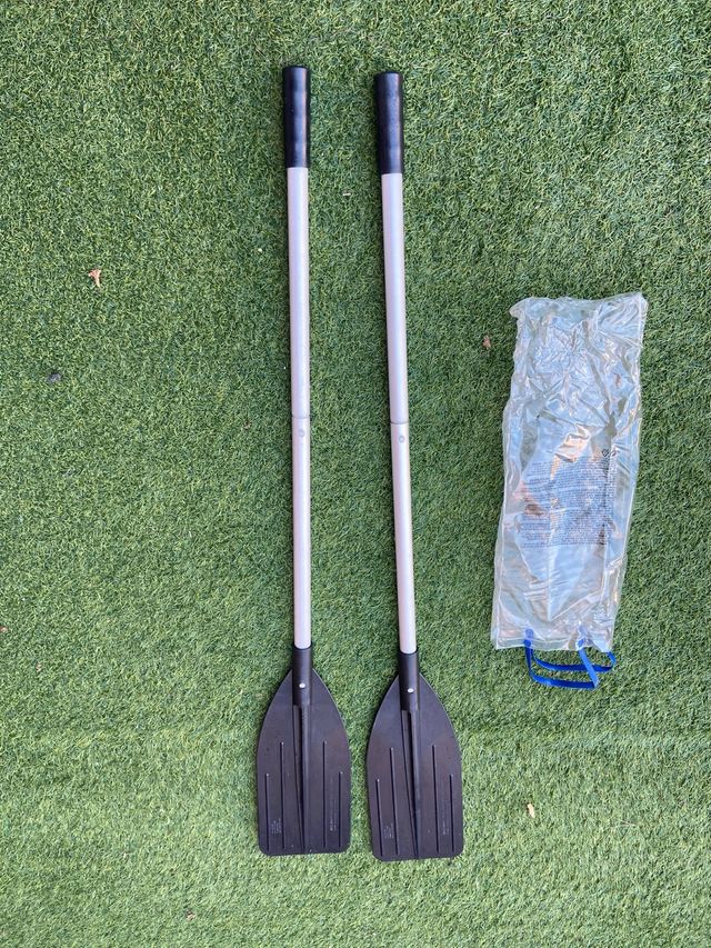 Par de remos plegables, ideales para llevar en tu embarcación. - Mangos con agarre negro. - Ejes de aluminio plateado. - Hojas de plástico negro.