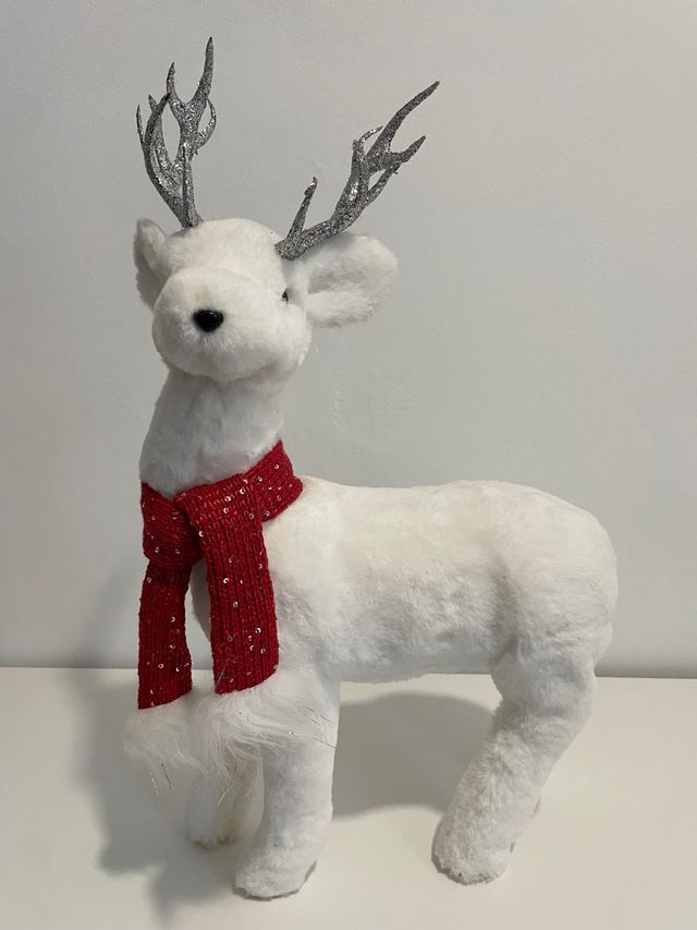 Reno navideño blanco decorativo con bufanda roja