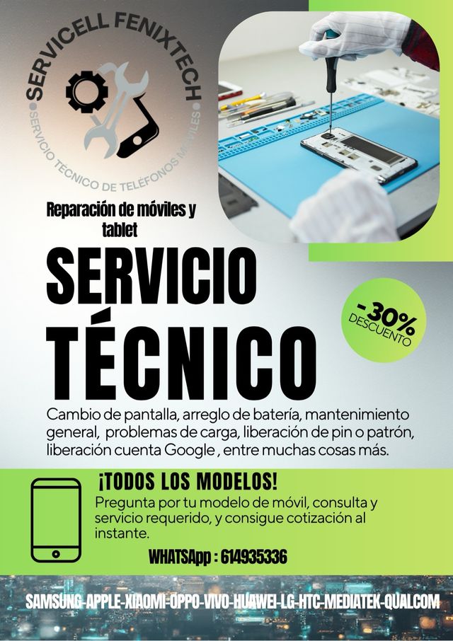 Detalles del productoReparación de móviles y tablet a precios super económicos no constamos con tienda física pero tenemos super precios con descuento en madrid .