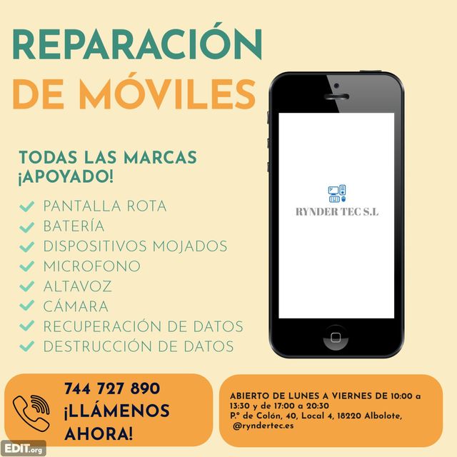 Detalles del productoOfrecemos un servicio profesional de reparación de móviles y tablets rápido, seguro y con garantía. Reparamos pantallas rotas, baterías agotadas, conectores dañados, cámaras, altavoces y más. Utilizamos repuestos de alta calidad y herramientas especializadas para asegurar un resultado duradero. Atención personalizada y presupuestos sin compromiso.