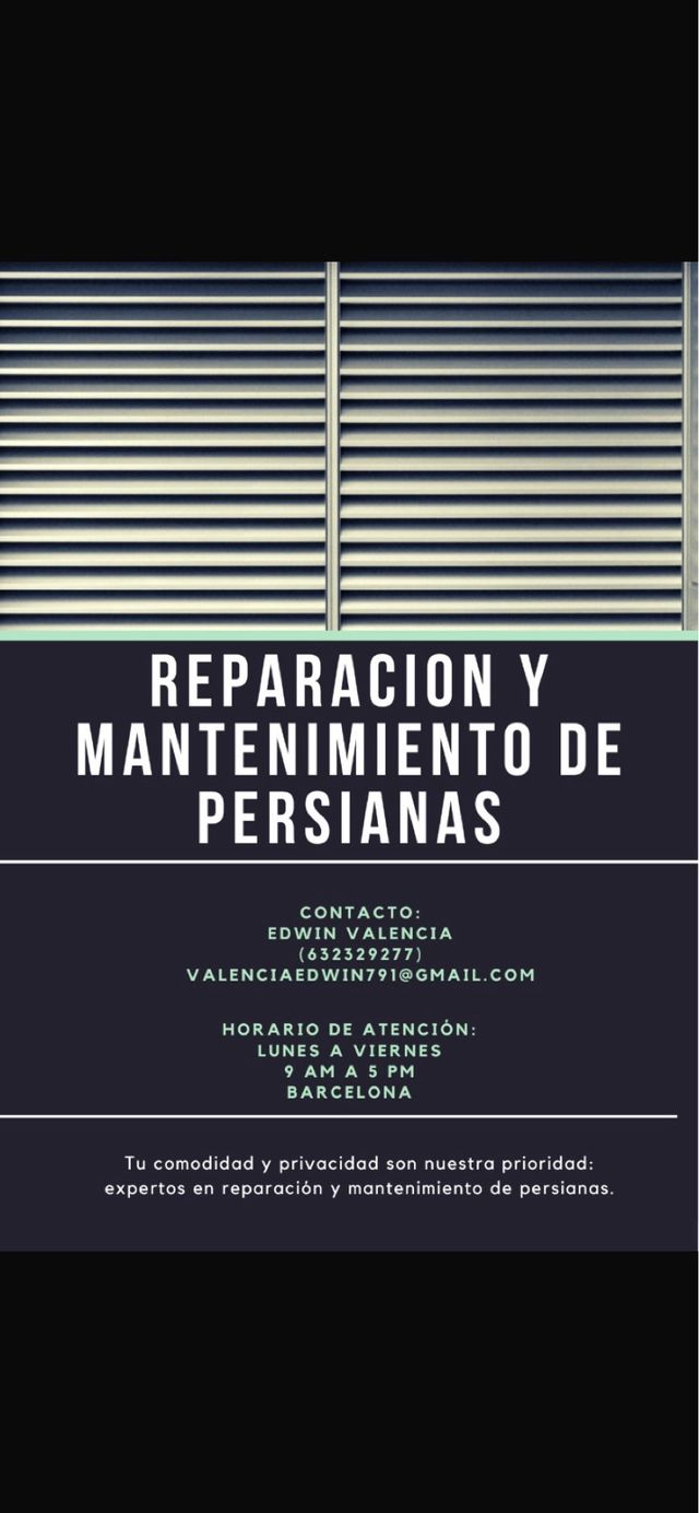 Detalles del productoOfrezco servicios de reparación y mantenimiento de persianas. Estoy disponible de lunes a viernes, de 9 AM a 5 PM. Contacta a Edwin Valencia al (632329277) o valenciaedwin791@gmail.com. Tu comodidad y privacidad son mi prioridad. Expertos en reparación y mantenimiento.
