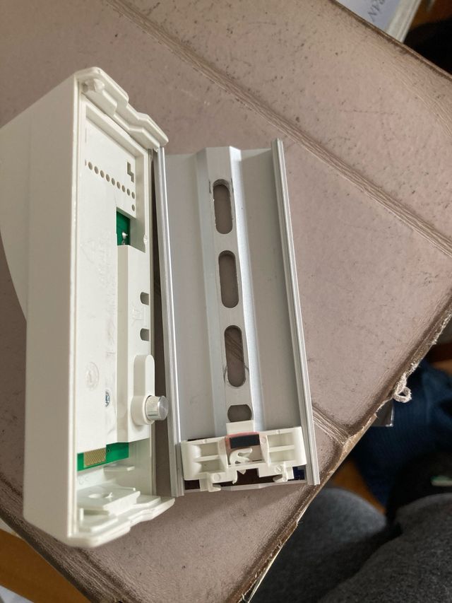 Repartidor de costes de calefacción. - Dispositivo de medición para radiadores. - Carcasa de plástico blanco y carril metálico.