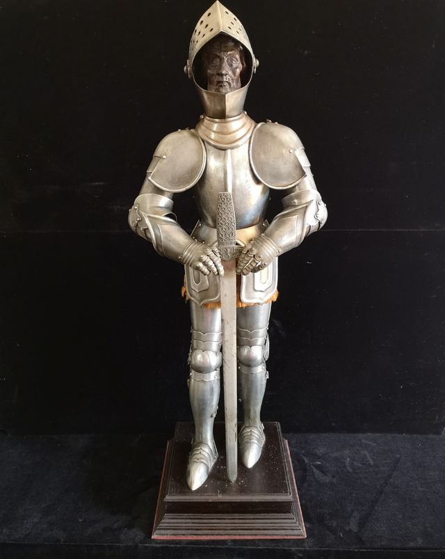 Detalles del productoRéplica en miniatura de una armadura medieval completa Toledo años 50 o anterior. Una pieza decorativa con gran detalle. Está completa pero algunos de los soportes de cuero se han deteriorado debido a su antigüedad; las hombreras ahora se sujetan con dos tornillos viejos; la espada también está dañada. Vea las fotos. Una pieza auténtica y antiguo de colección