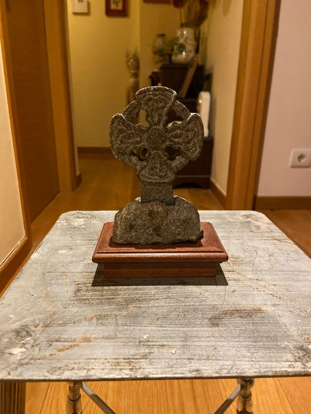 Réplica de una cruz celta gallega, con una base de madera. - Diseño detallado. - Base de madera oscura.