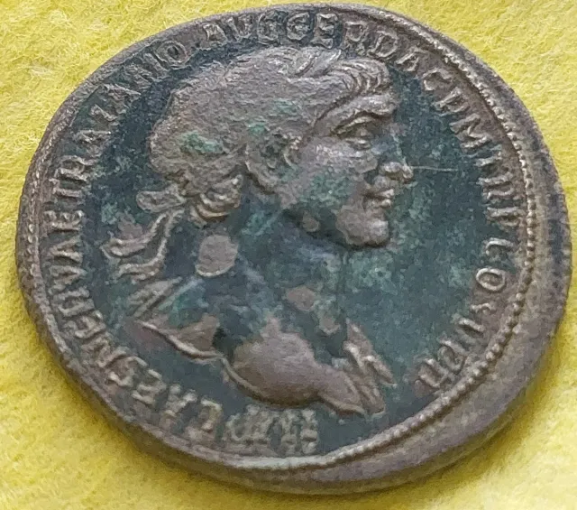 Réplica de moneda romana antigua. Presenta un diseño detallado con un perfil. - Material: Bronce - Diámetro: 33 mm aprox.