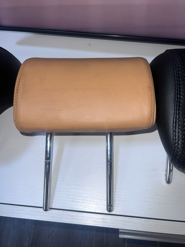 Reposacabezas de coche en color beige, con varillas metálicas. - Tapicería de cuero. - Diseño acolchado.