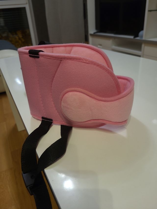 Reposacabezas acolchado para coche, ideal para viajes largos. - Color rosa. - Material suave y cómodo. - Correas ajustables para mayor seguridad.