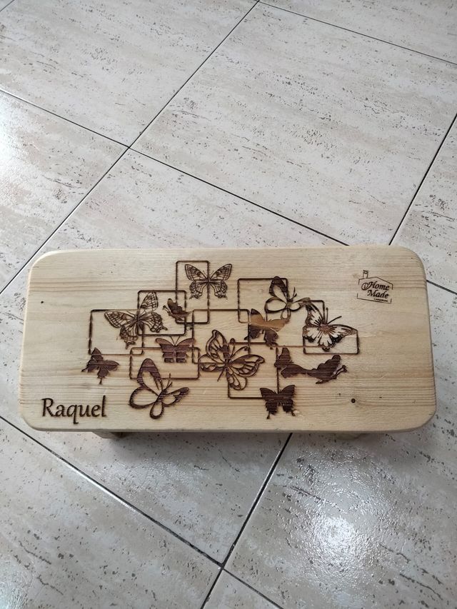 Reposapiés elaborado con madera reciclada, barnizado con barniz al agua, y con el grabado que prefieras.
