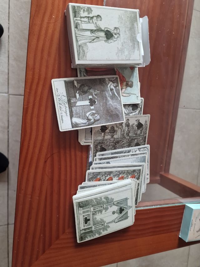 Detalles del productoReproducción de una baraja de cartas alemana del siglo XIX, datada en 1806. Las ilustraciones son grabados en blanco y negro con un estilo clásico.