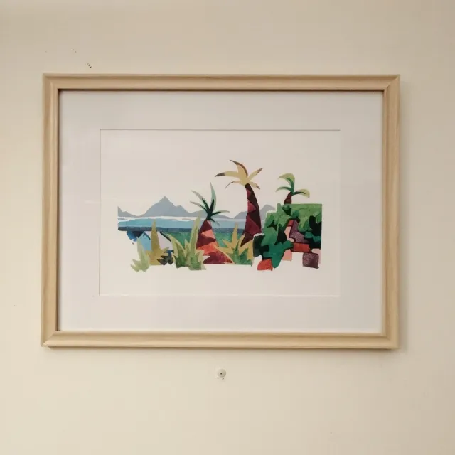 Detalles del productoReproducción de una pintura a gouache con un paisaje tropical, lista para colgar.