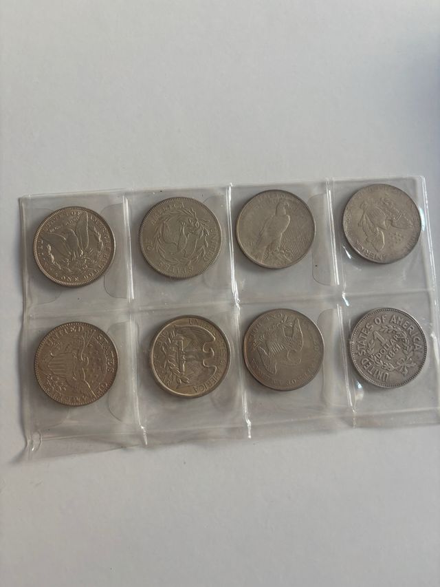 Conjunto de reproducciones de monedas de dólar. - Diseño de águila. - Diseño de perfil. - Diseño de corona de laurel.