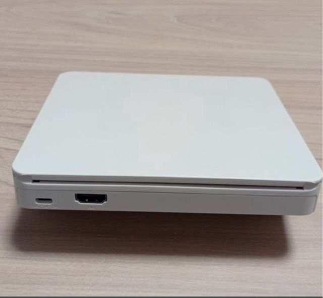 Reproductor multimedia compacto y elegante en color blanco. - Diseño moderno y discreto. - Puertos de conexión visibles.