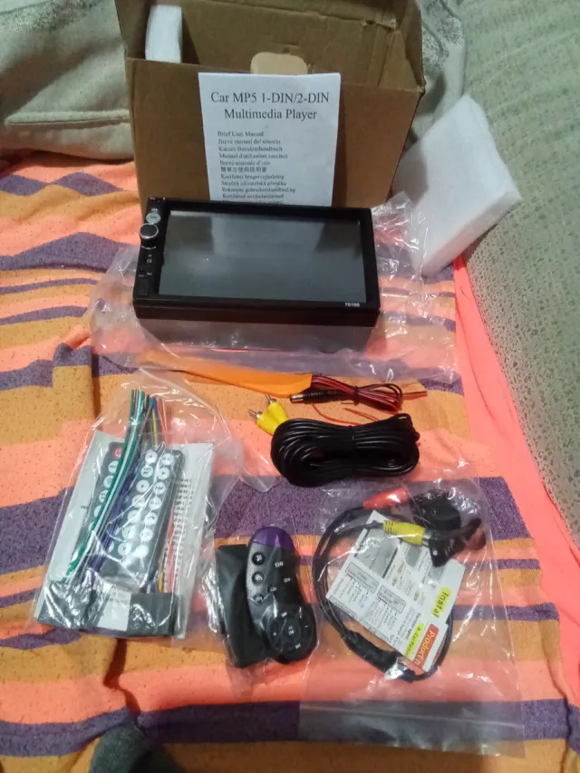 Detalles del productoReproductor multimedia para coche MP5, compatible con formatos 1-DIN y 2-DIN. Incluye varios accesorios para su instalación y uso.