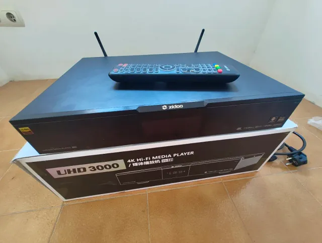 Detalles del productoReproductor multimedia Zidoo UHD 3000 en color negro. Incluye mando a distancia y antenas. (Para piezas) No enciende