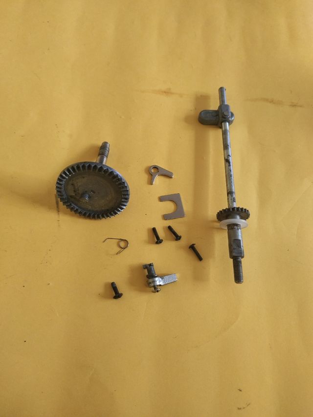 Conjunto de piezas de repuesto para la máquina Daiwa DF 100. - Engranaje principal. - Eje con engranaje. - Tornillos varios. - Resorte. - Piezas metálicas de sujeción.