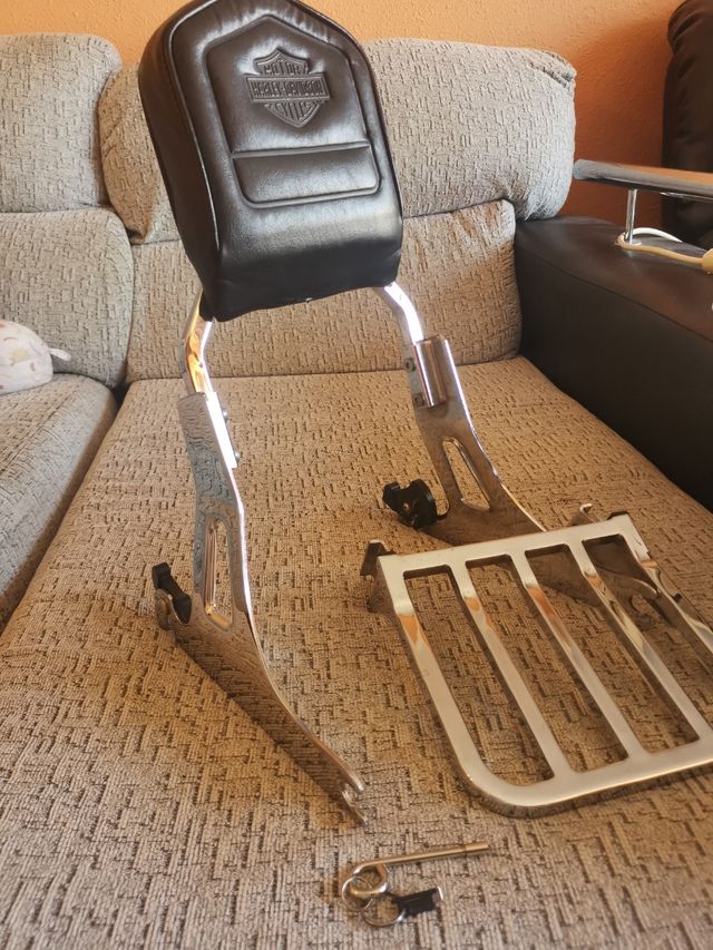 Detalles del productoRespaldo para pasajero Harley FXD con parrilla portaequipajes. Está en muy buen estado. Incluye respaldo acolchado de cuero con el logo gofrado, emblema en la parte trasera y parrilla cromada. Se entrega con llave para dejarlo bloqueado.