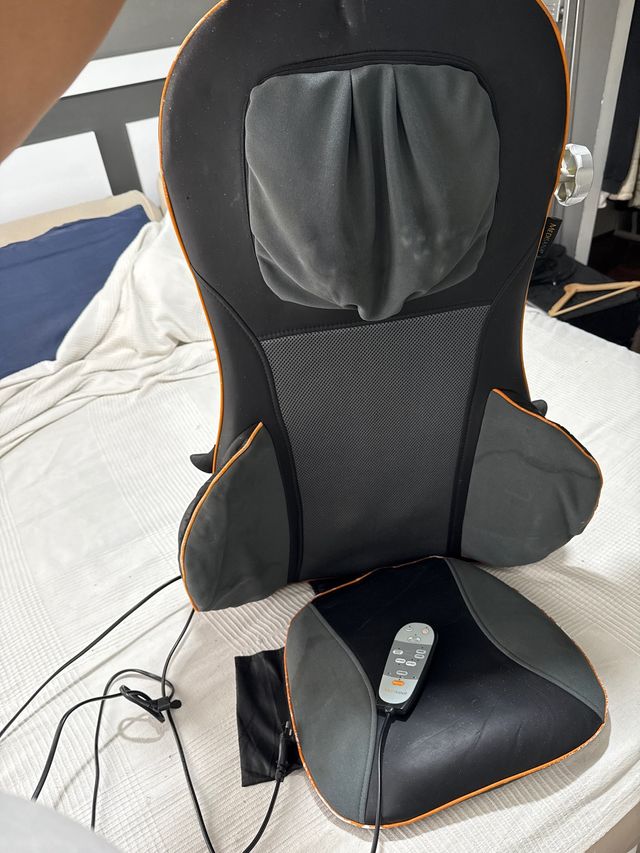 respaldo de masaje adaptable le a cualquier silla. mando para masaje en cervicales, lumbares, dorsales... también aporta calor si se desea