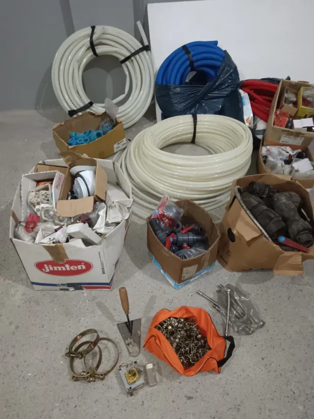 Detalles del productoLote de restos de materiales de albañilería y fontanería, ideal para proyectos o reparaciones.