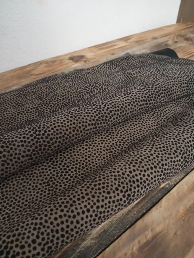 Detalles del productoRetal de piel con un diseño de puntos negros sobre fondo beige.